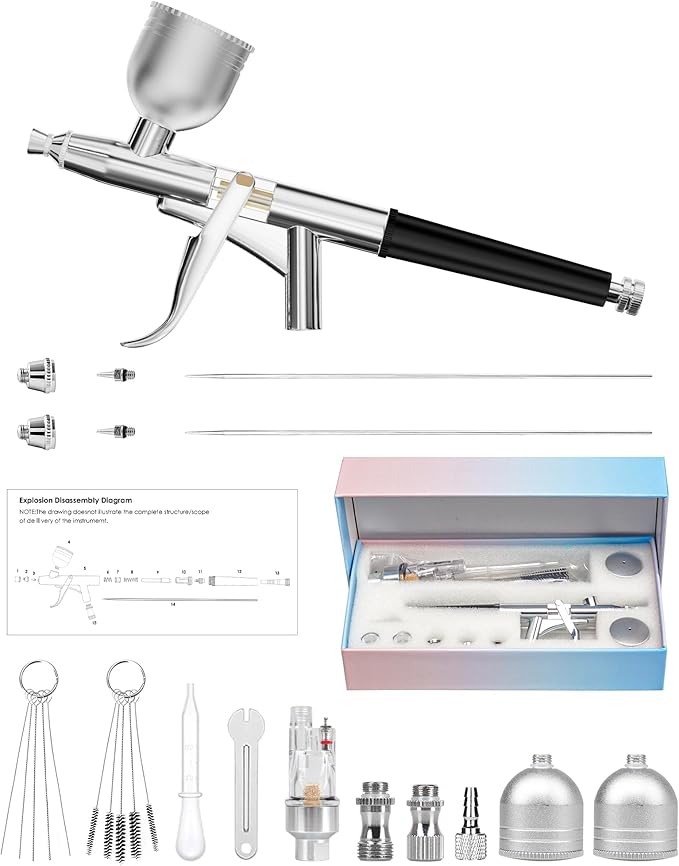 Link to Product: Airbrush Kit Airbrush Gun DualAction Gravity with 0.2 0.4 & 0.5mm NeedleCleaning Sets Air Brush with 2 13 oz Fluid Cup for Painting Modeling Cake Decor Pastry Makeup Nail Art etc.