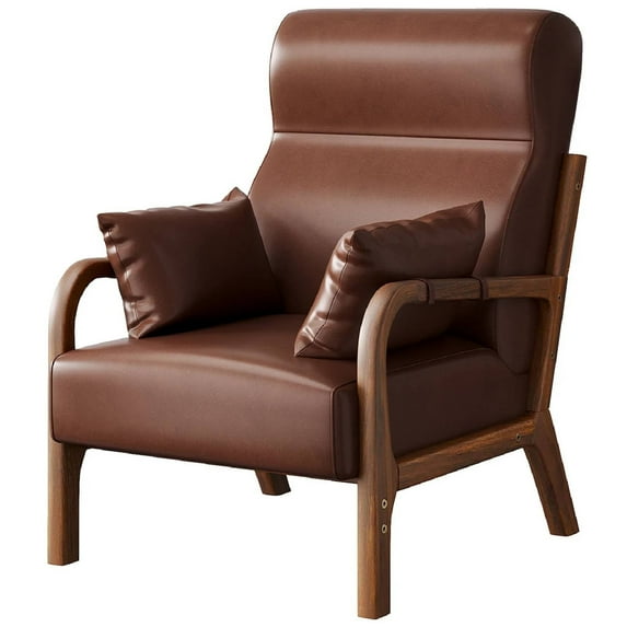 Link to Product: Bestier Mid-Century Modern Accent Chair with Solid Wood Frame & Pillows, 37" Upholstered Reading Lounge Chair for Living Room, Bedroom, Brown PU Leather
