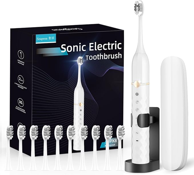 Link to Product: Electric Toothbrush Set Equipped with 10 Brush Heads and Travel case IPX8 Waterproof 2Minute Timer 42000 highFrequency Vibrations 5 Modes The First Choice for Gift Giving
