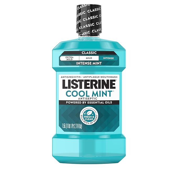 Link to Product: Listerine Cool Mint Antiseptic Mouthwash Daily Oral Rinse Kills 99% of Germs that Cause Bad Breath Plaque and Gingivitis for a Fresher Cleaner Mouth Cool Mint Flavor 1.5 L